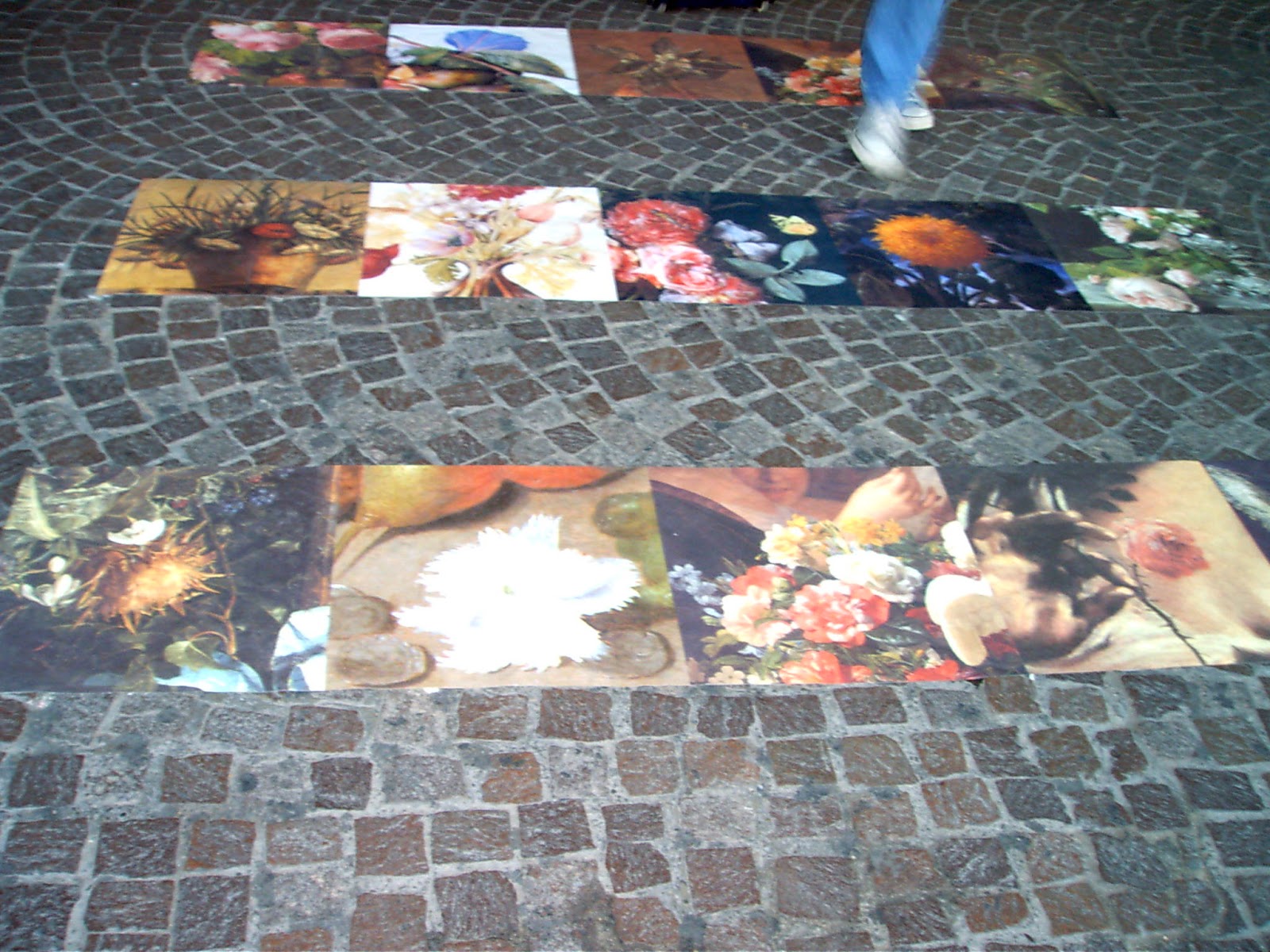 Un percorso attraverso linee spezzate, memorie interrotte; lo sguardo cade sui frammenti di fiori dipinti, petali dal passato per immaginare e ricordare.